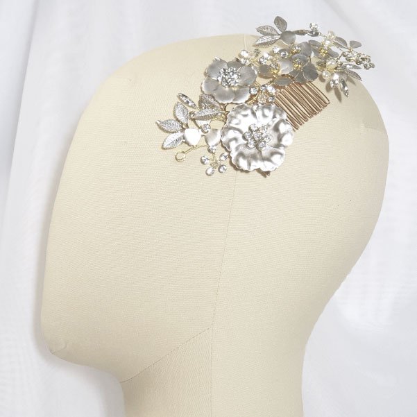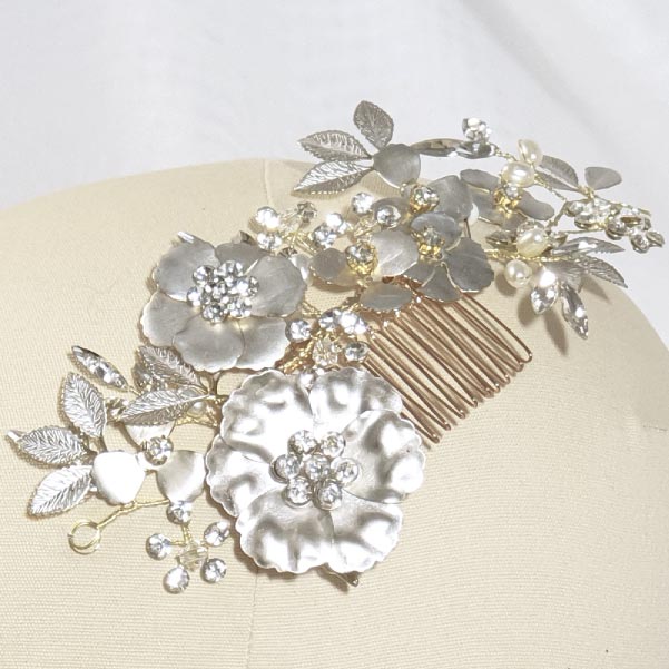 Golden vine, flowers made from light silver metallic foil and semi-gloss silver laurel leaves