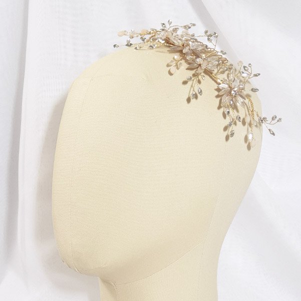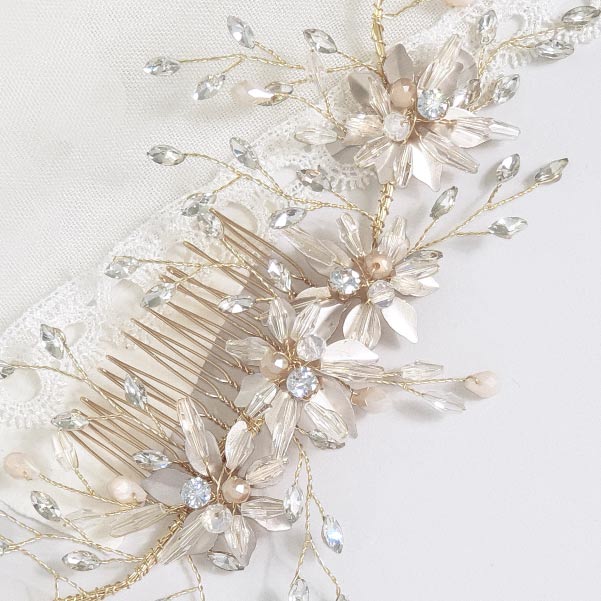 Soft silver/rose brushed metal leaves, Swarovski crystals, opaque opal and rose beads, pipette beads gold trim.